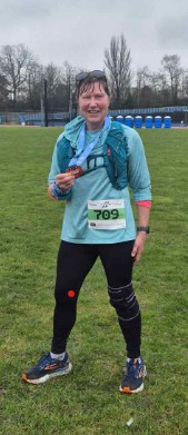 Jo said ‘It was a little soggy but had much better conditions than those who raced in various places yesterday. I had a good run in the hilly course. I came 1st female, ran 10-mile PB, 3-minute course PB and a FV40 club record’.